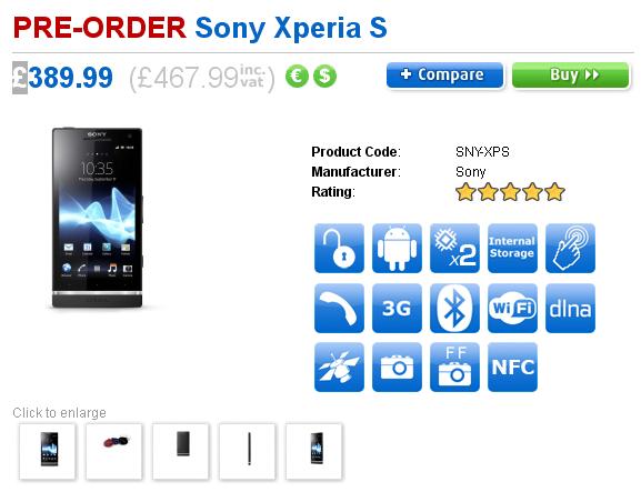 A pochi giorni dalla sua presentazione, il nuovo gioiellino Sony Xperia S fa già la sua apparizione sul noto sito britannico ‘Clove’, dove è disponibile in pre-ordine al costo di 467,99 sterline (ovvero circa 564 euro), tasse incluse, e sarà disponibile a partire dal 5 marzo.