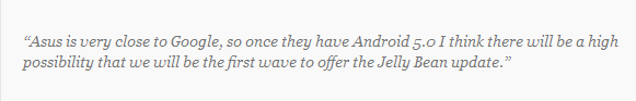Asus si dimostra sempre molto attenta e tempestiva nella politica degli update, ed anche in questo caso non si smentisce, Benson Lin, vice presidente di Asus, durante una piccola intervista con TechRadar, ha espresso la volontà di essere nella prima ondata di aggiornamenti del nuovo OS Android, destinato principalmente ai Tablet.