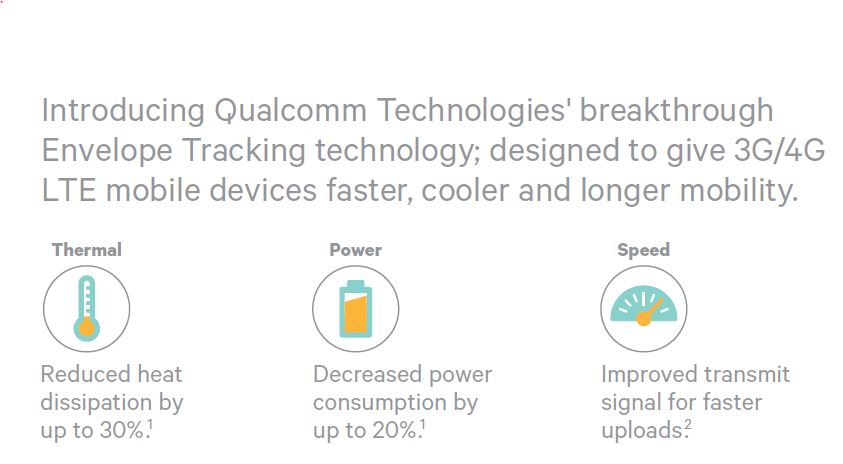 Il chip di Qualcomm che usa la tecnica di Envelope Tracking invece aggiusta dinamicamente i valori di voltaggio forniti al PA, massimizzando in questo modo l’efficienza energetica dello stesso tenendolo in compressione sull’intero ciclo di modulazione, invece che solo nei valori di picco.