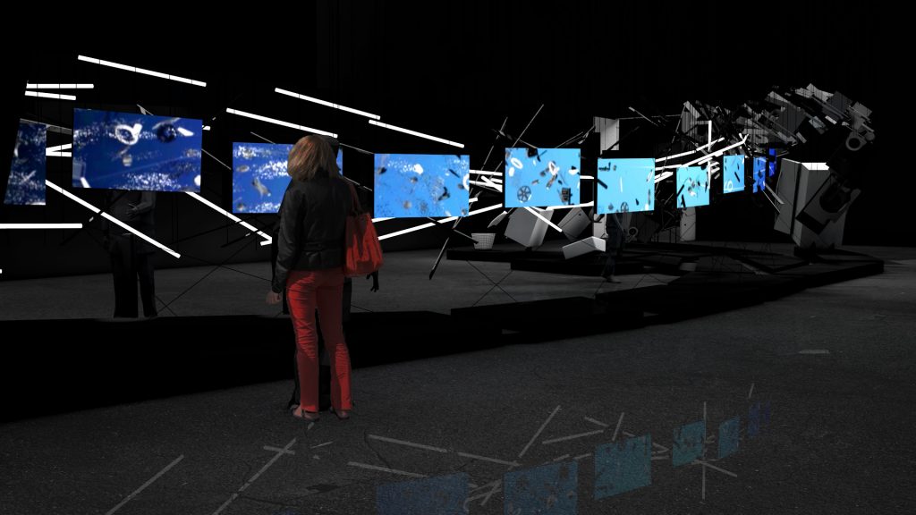 Scomposta idealmente in quattro momenti, l’installazione proietta i visitatori in un viaggio che dal presente arriva al futuro, attraverso la scomposizione e ricomposizione in forma nuova della materia.