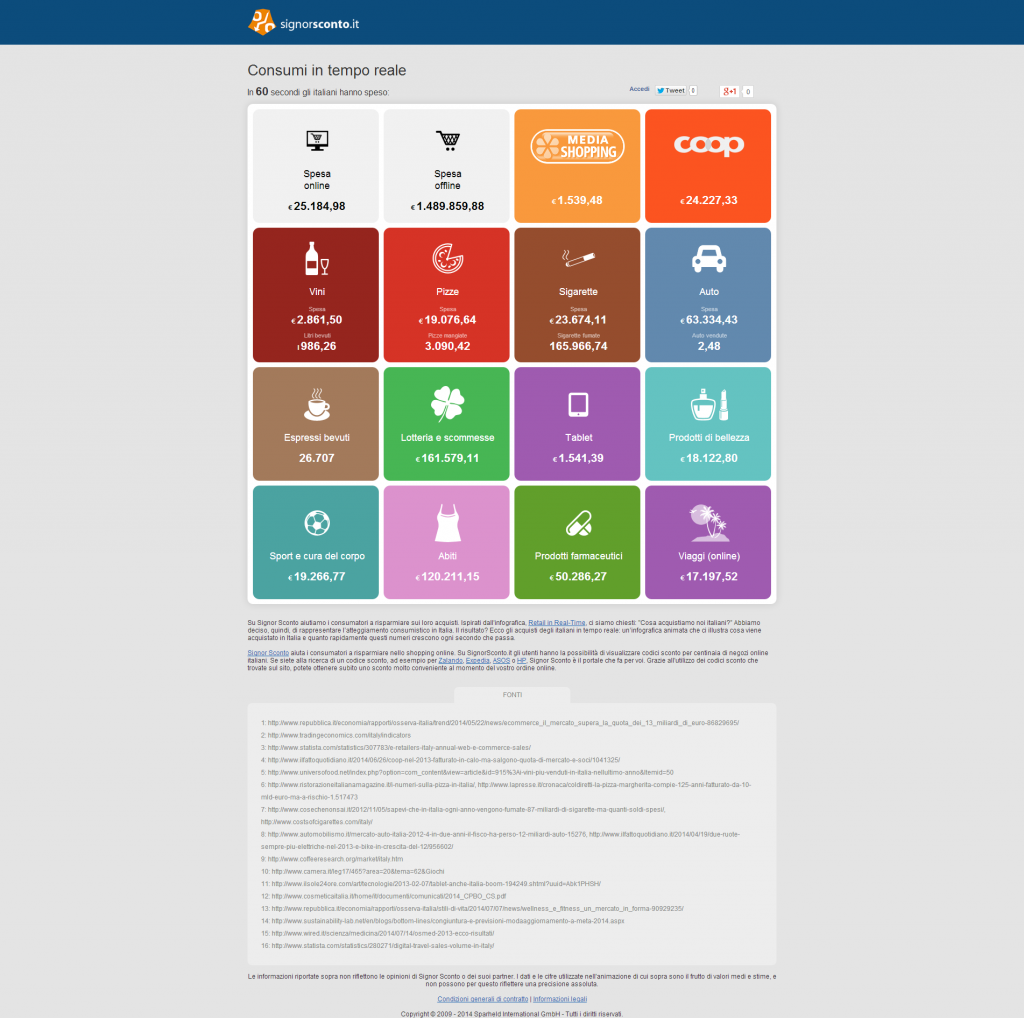 A illustrare con un’infografica animata i consumi degli italiani in tempo reale, sia online che offline, ci ha pensato Signor Sconto (oltre 60.000 utenti unici al mese e oltre 200.000 pageviews, qui la pagina Facebook), il portale di codici sconto che permette di risparmiare sugli acquisti online in tantissimi negozi sul web grazie ai numerosi codici sconto, spesso esclusivi, e alle offerte che mette a disposizione ogni giorno. Abbigliamento e moda, Profumi e Cosmetici, Elettronica, Idee Regalo, Prodotti per l’Infanzia, Viaggi… sono solo alcune delle categorie dei negozi online con codici sconto, che si possono trovare su Signor Sconto.