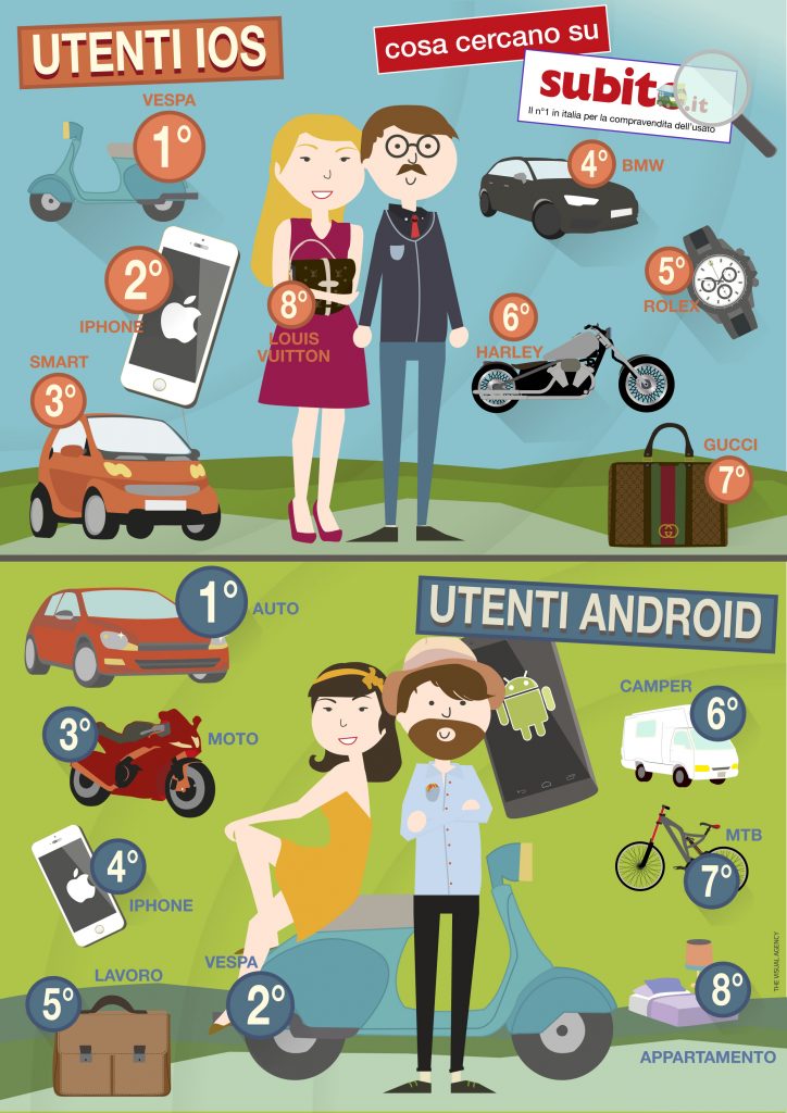 In generale, chi accede alla app Subito.it tramite iPhone denota una propensione maggiore alla spesa ricercando per lo più beni di lusso. Sul fronte lifestyle, infatti, al primo posto delle dieci parole più comuni, il termine Mtb (MountainBike) è seguito da Rolex, al settimo posto della classifica generale e a marchi fashion come Gucci e Louis Vuitton. La parola Barca si trova alla nona posizione della classifica lifestyle.