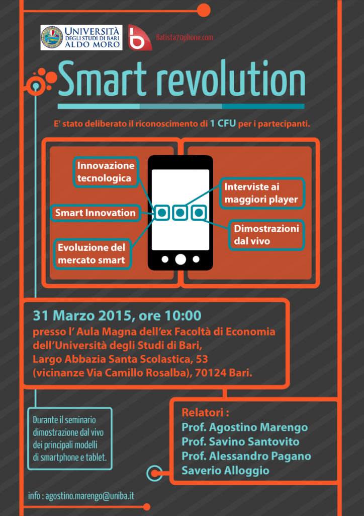 Quest’oggi, con grande orgoglio, posso annunciarvi la realizzazione di un grande evento che vede uniti Batista70 e l’Università degli Studi di Bari. Martedì 31 Marzo 2015 ore 10, presso l’Aula Magna dell’ex Facoltà di Economia di Bari (Largo Abbazia Santa Scolastica 53, vicinanze Via Camillo Rosalba, Bari), avrò l’onore di essere uno dei relatori all’interno di un seminario didattico denominato “Smart Revolution”, insieme ai professori Agostino Marengo, Savino Santovito e Alessandro Pagano. Come si evince facilmente dal titolo, ci occuperemo di descrivere lo sviluppo avuto da smartphone e tablet negli ultimi anni, partendo dalla presentazione del primo iPhone avvenuta nell’ormai lontano 2007. Grazie agli uffici stampa Sony, Samsung, Htc, Huawei (e tanti altri si stanno aggiungendo in questi giorni), avremo la possibilità di mostrare dal vivo il funzionamento di alcuni smartphone, tablet e wereable devices, dando la possibilità di provarli a tutti i partecipanti. La seconda parte del seminario sarà dedicata alla descrizione del mio lavoro di tesi, dedicato all’e-learning applicato ai dispositivi mobili. Tutto lo staff di Batista70 ha partecipato alla creazione dei contenuti del seminario e quindi, oltre che ringraziare sentitamente il professor Agostino Marengo ed il professor Alessandro Pagano per questa grande opportunità e per il loro aiuto, ringrazio anche Loris e tutti i ragazzi dello staff che mi stanno aiutando. Il seminario è ovviamente aperto al pubblico per cui tutti voi che ci seguite dalla Puglia non esitate a recarvi il 31 Marzo a Bari, abbiamo tante sorprese in servo per voi. Concludo con una piccola comunicazione di servizio: per tutti i lettori che frequentano la Facoltà di Economia, vi ricordo che il seminario ha valenza di 1 CFU per tutti i corsi di laurea triennale, da ritirare presso l’auletta dell’associazione Studenti Indipendenti Economia. L’evento sarà trasmesso in diretta streaming sul canale youtube di Batista70….diamo avvio alla SmartRevolution!