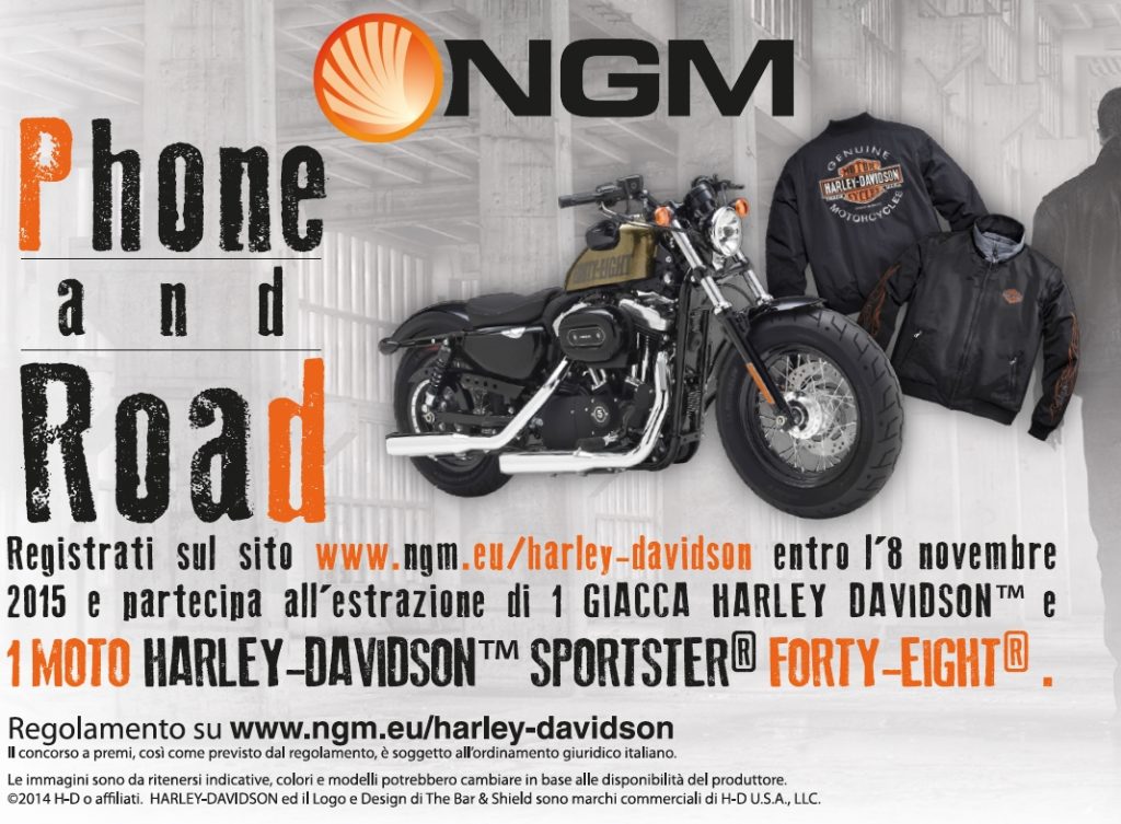 Considerato il grande successo che sta riscuotendo il concorso “Phone and Road” NGM ha deciso di estendere la possibilità di parteciparvi . Fino al 08 novembre 2015 è possibile registrare sul mini sito dedicato www.ngm.eu/harley-davidson lo smartphone NGM Harley-Davidson® acquistato entro il 31 ottobre per partecipare all’estrazione di una moto Harley-Davidson® Sportster® Forty-Eight® dal valore commerciale di 12.100€ e di una giacca in pelle Harley-Davidson® dal valore commerciale di 600€. In questo modo i clienti NGM avranno anche la possibilità di entrare direttamente nel gruppo dei motociclisti più ribelli di tutto il mondo o di viverne lo spirito nell’abbigliamento. Il concorso viene veicolato anche attraverso una comunicazione sui punti vendita realizzata con brochure e cartelli da banco che riportano le caratteristiche del telefono e le condizioni per partecipare al concorso.