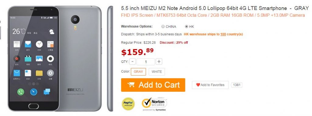 Il noto sito di eCommerce GearBest ci propone il Meizu M2 Note all’ottimo prezzo di 159.89$: http://www.gearbest.com/cell-phones/pp_197994.html, i prodotti sono sono spediti da Hong Kong con Italy Express, i tempi di consegna sono di circa 6-9 giorni lavorativi e generalmente non ci sono costi di dogana.