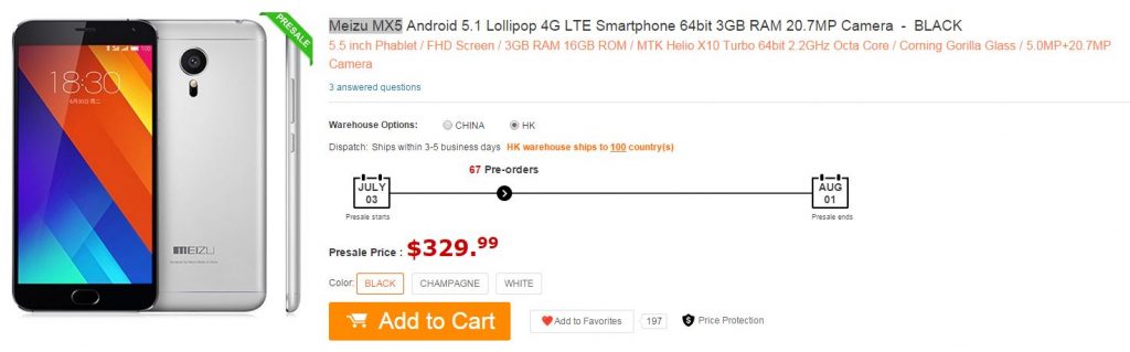 Il nuovissimo Meizu MX5 è in offerta su GearBest al costo di 329.99$: http://www.gearbest.com/cell-phones/pp_203836.html i prodotti sono sono spediti da Hong Kong con Italy Express, i tempi di consegna sono di circa 6-9 giorni lavorativi e generalmente non ci sono costi di dogana.