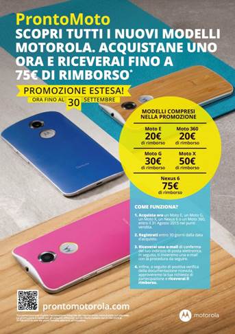 Partecipare è molto semplice: tutti gli acquisti di un nuovo Moto E, Moto G, Moto X, Nexus 6 o Moto 360 effettuati tra il 1 e il 30 Settembre 2015 in uno dei punti vendita aderenti (http://www.prontomotorola.com/puntivendita.html) possono essere registrati entro 30 giorni dall’acquisto sul sito dedicato www.prontomotorola.com per avere diritto ad uno sconto accreditato direttamente su conto bancario.