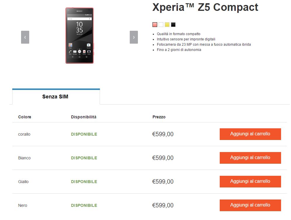 E’ da oggi disponibile, nello shop ufficiale, il Sony Z5 Compact a 599€ nei colori corallo, bianco, giallo e nero, per il fratello maggiore si può procedere al preordine, prezzo 699€ e consegne previste dal 2 Ottobre nei colori verde, nero, bianco e oro.