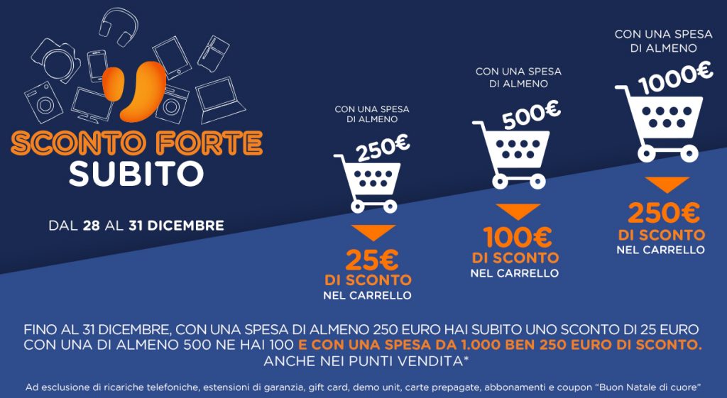 Da oggi 28 e fino al 31 Dicembre, in tutti gli store fisici e online, Unieuro propone una promozione denominata “Forte Sconto”, che consiste in uno sconto immediato in cassa, su tutti i prodotti realmente disponibili, di: