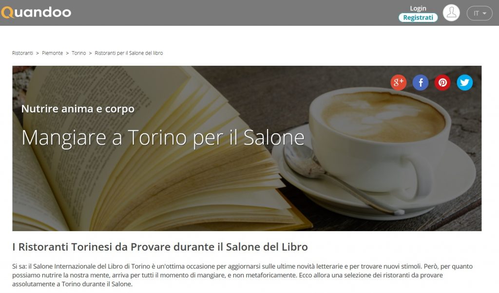 Per ulteriori informazioni sui ristoranti torinesi selezionati per la settimana del Salone Internazionale del Libro cliccare qui: https://www.quandoo.it/torino/collections/salone-del-libro?TC=IT_IT_CRM__&utm_source=newsletter&utm_medium=email&utm_content=button_text_stand_alone&utm_campaign=IT_IT_CRM__