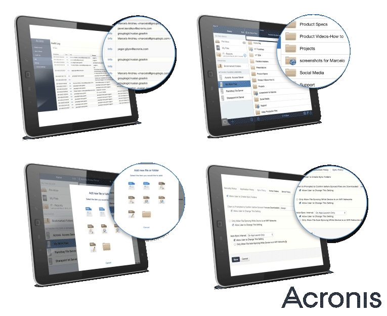 “L’accesso, la sincronizzazione e la condivisione dei file mobili rappresentano un elemento integrale di ogni business. I dipendenti di oggi trascorrono ore a lavorare ai propri dispositivi mobili, sia a casa che in viaggio. In assenza di una soluzione sicura come Acronis Access Advanced, possono incappare in rischi considerevoli per i dati aziendali. Acronis Access Advanced fornisce ai datori di lavoro una modalità semplice per monitorare ciò che viene condiviso e chi accede ai dati. Si tratta di un’importante misura di sicurezza per ogni impresa,” afferma Gaidar Magdanurov, Chief Marketing Officer presso Acronis.
