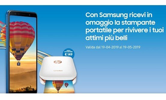 Samsung ha avviato una nuova promozione, che consente di avere in omaggio la stampante portatile HP Sprocket (Z3Z91A), a tutti i futuri acquirenti che acquisteranno uno smartphone Galaxy A 2018 o J, fino al prossimo 19 maggio 2019.