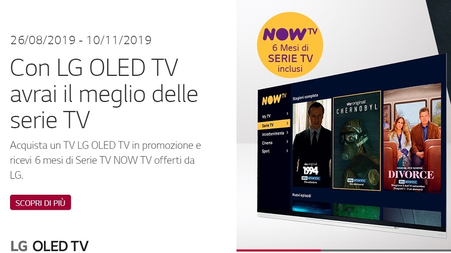 Da oggi, 26 agosto, e fino al 10 novembre 2019 acquistando un LG OLED TV 2019 in promozione*, sarà possibile ricevere in regalo 6 mesi di Serie TV NOW TV, la internet TV di SKY che permette di vedere numerosi contenuti live e on-demand senza contratto e in alta definizione (per maggiori è possibile consultare questo link).