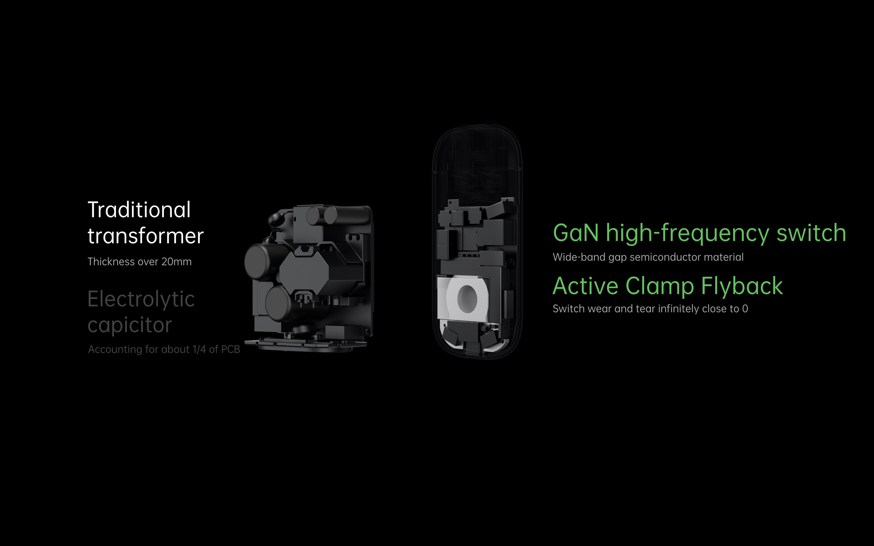 Gli ingegneri di OPPO hanno progettato un’architettura rivoluzionaria per il mini-caricabatterie SuperVOOC da 50W e hanno ridotto le dimensioni dei componenti che occupano il maggior spazio utilizzando un nuovo design topologico. Ciò fornisce una conversione di potenza altamente efficiente rimuovendo il condensatore elettrolitico convenzionale e introducendo la