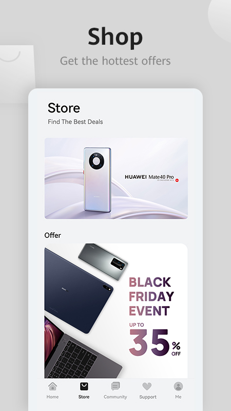 • Store: sezione dove cercare e acquistare i prodotti Huawei direttamente su Huawei Store;