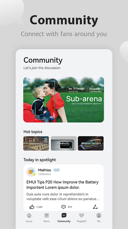 • Community: sezione in cui gli utenti Huawei possono comunicare e interagire tra loro;