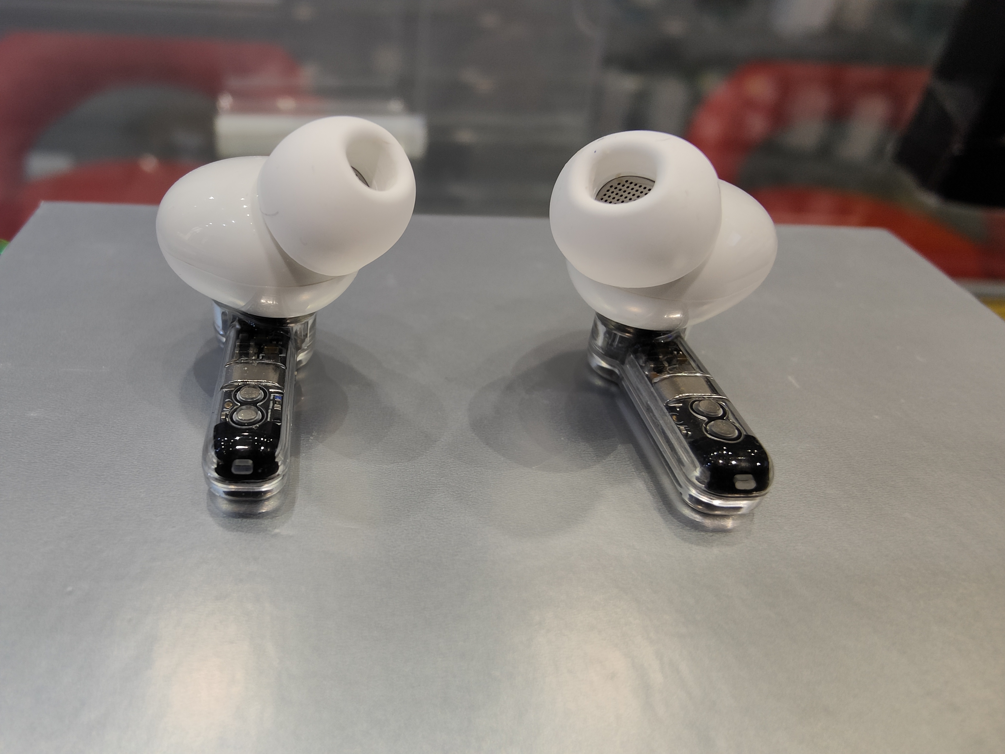 Di concezioni in ear e molto simili come forma agli AirPods Pro di Apple, si differenziano dal fatto di avere lo stelo trasparente, come il case del resto, perfettamente assemblato, mostrando quindi un lavoro di ingegnerizzazione enorme e preciso.