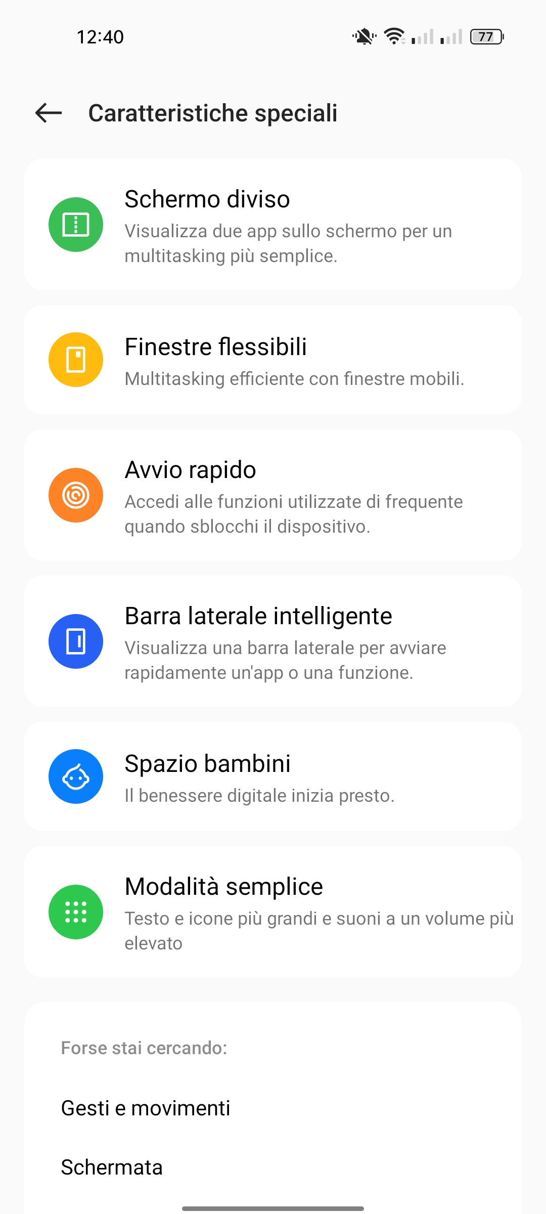 Presenti inoltre uno spazio bambini e la modalità semplificata, utile per chi vuole concedere lo smartphone ai propri figli limitandone l’utilizzo o per le persone anziane che necessitano di poche icone di dimensioni elevate.