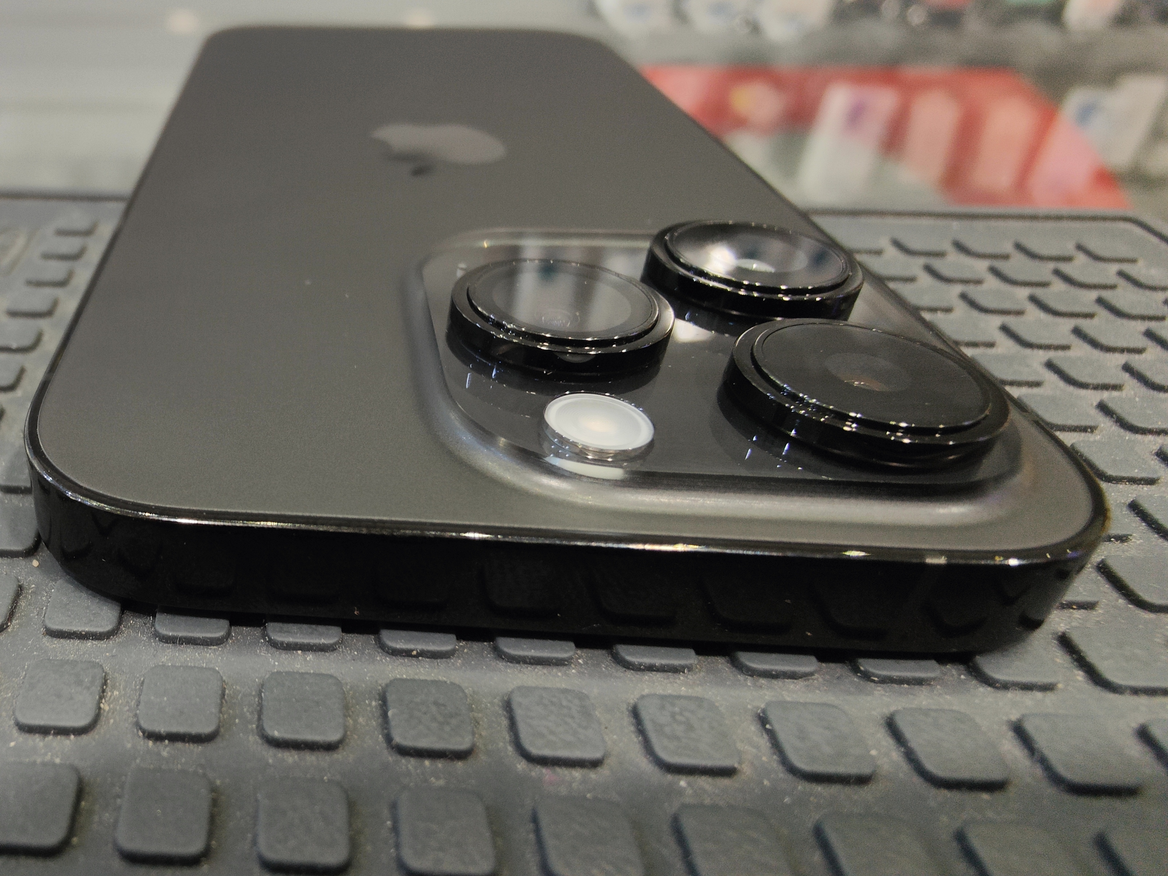 Oltre al logo Apple, posto al centro, in alto a sinistra è posizionato il comparto cam principale, in rilievo e all’interno di una sezione lucida, ancora più ampio e imponente di quello al quale eravamo abituati nei precedenti modelli, caratterizzato dai 3 sensori cam, il flash led e il sensore.