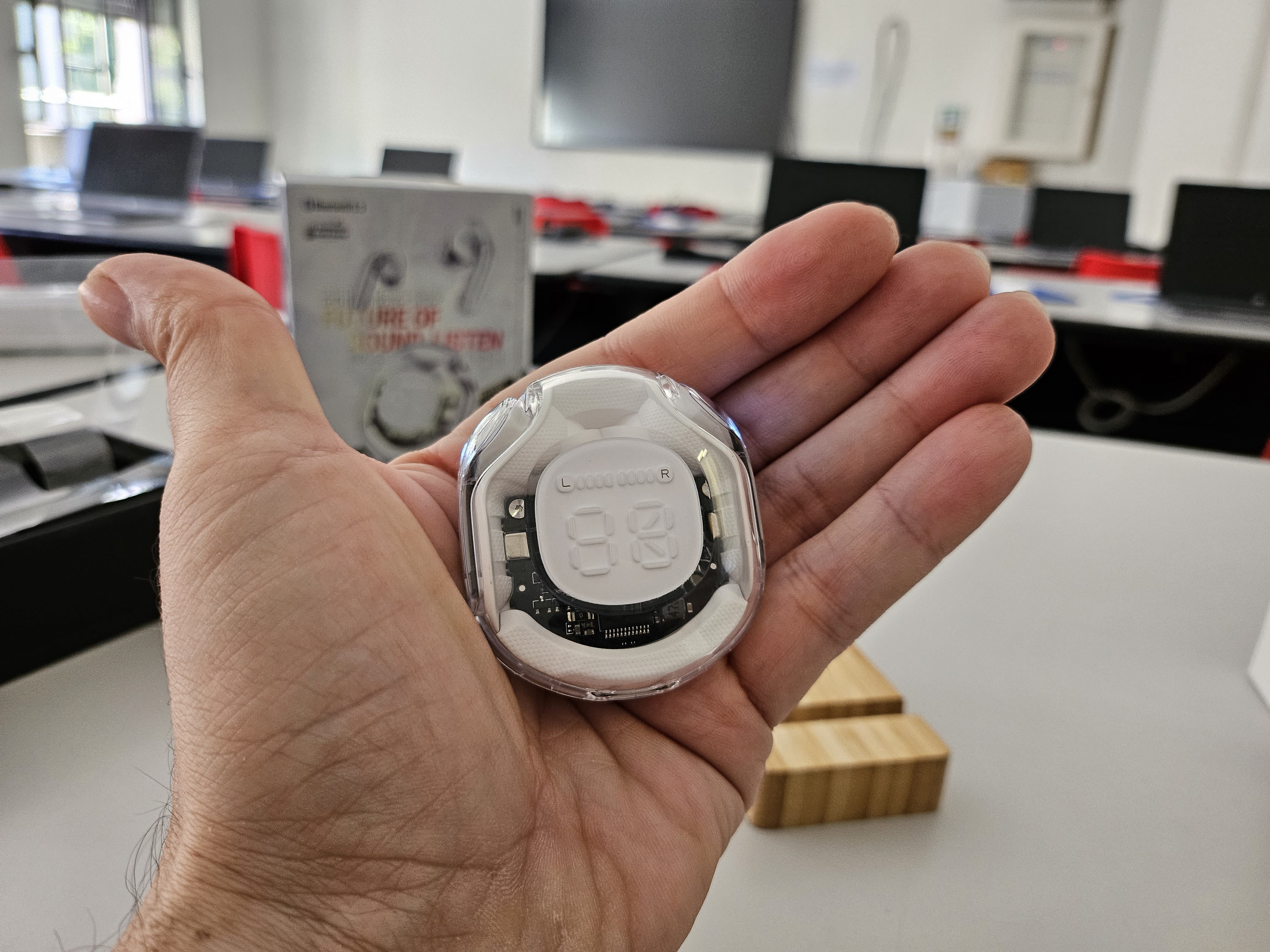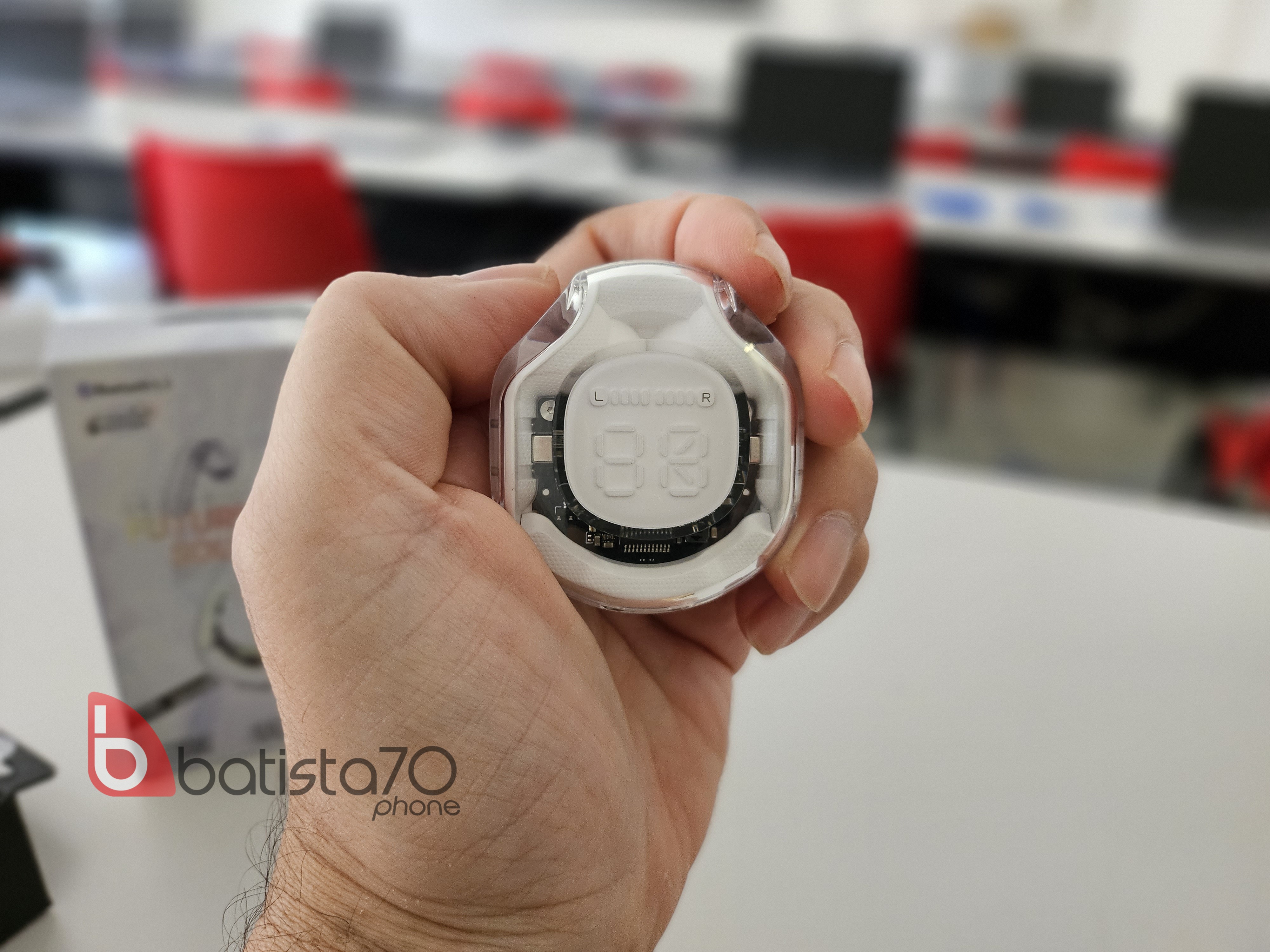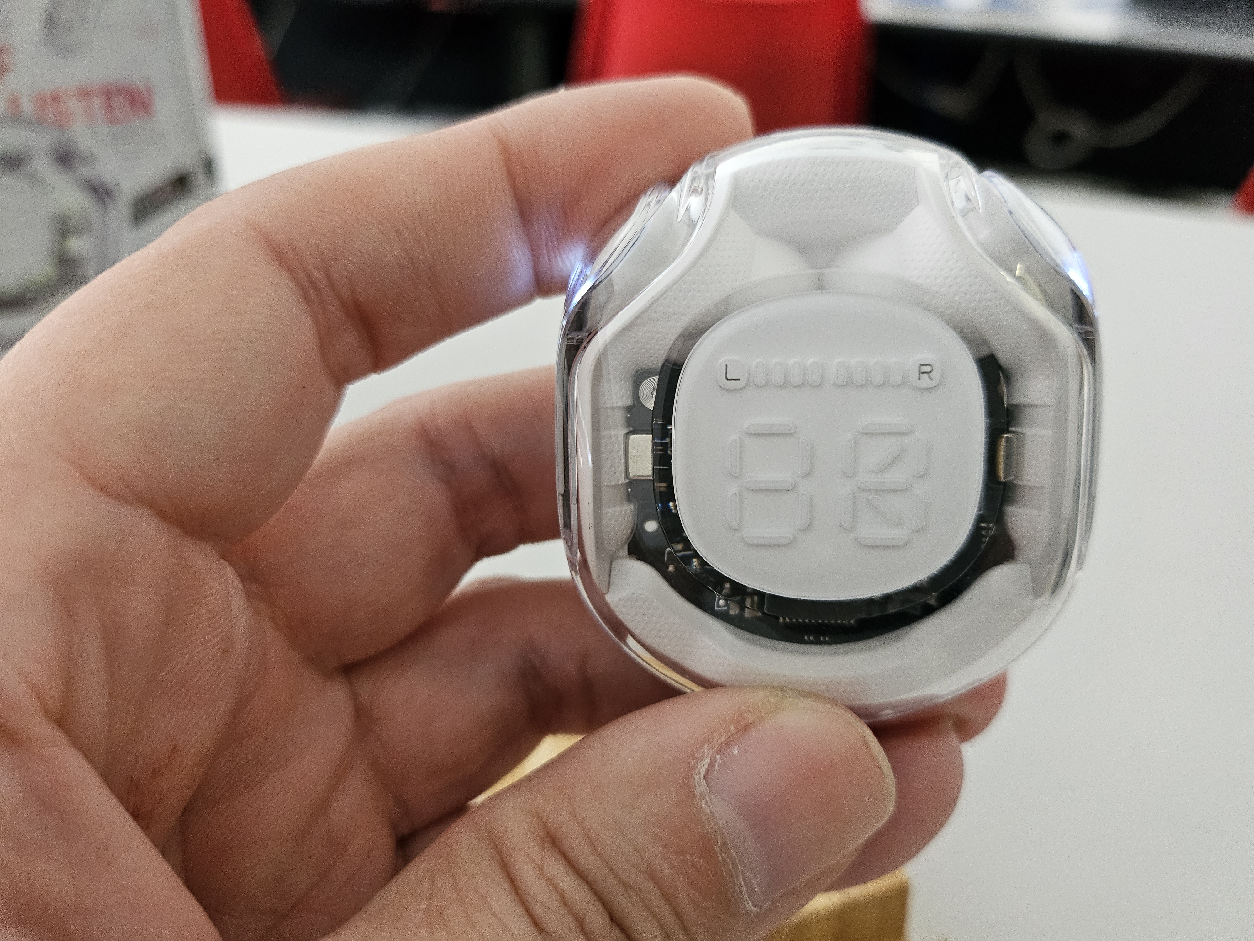 Le cuffie sono trasparenti, permettendo di vedere i circuiti all’interno della custodia e delle cuffie stesse, un dettaglio che aggiunge un tocco di eleganza.