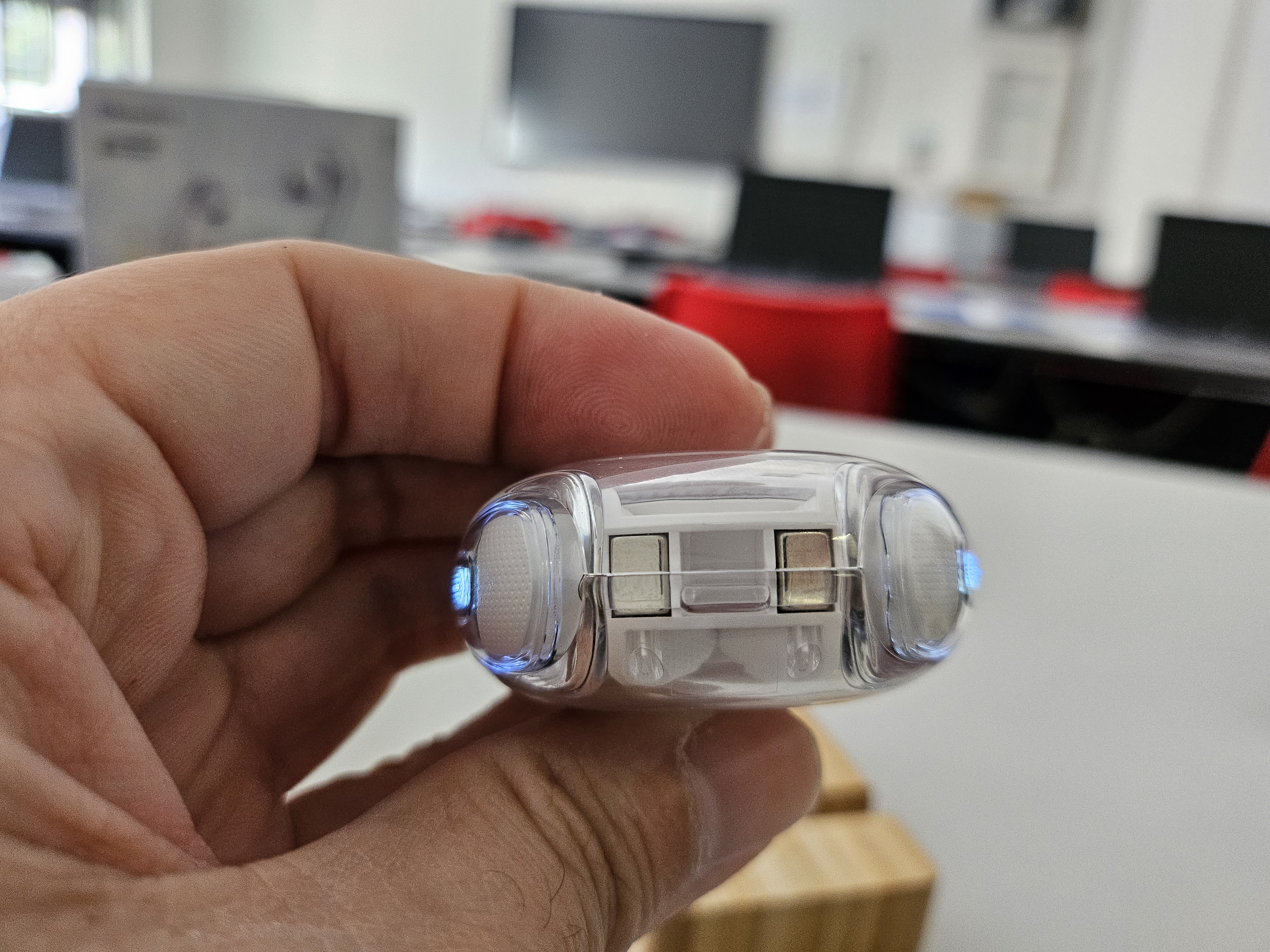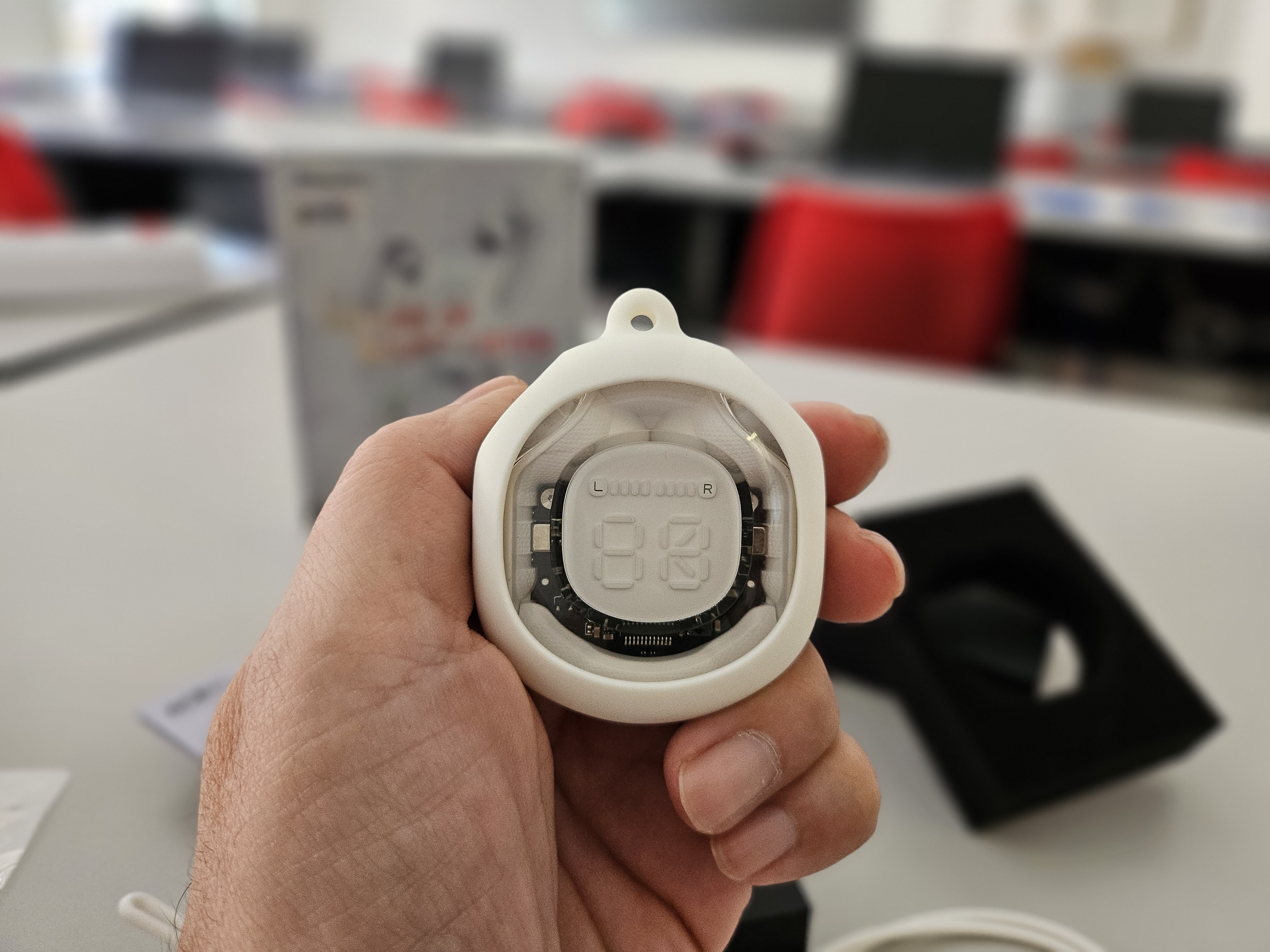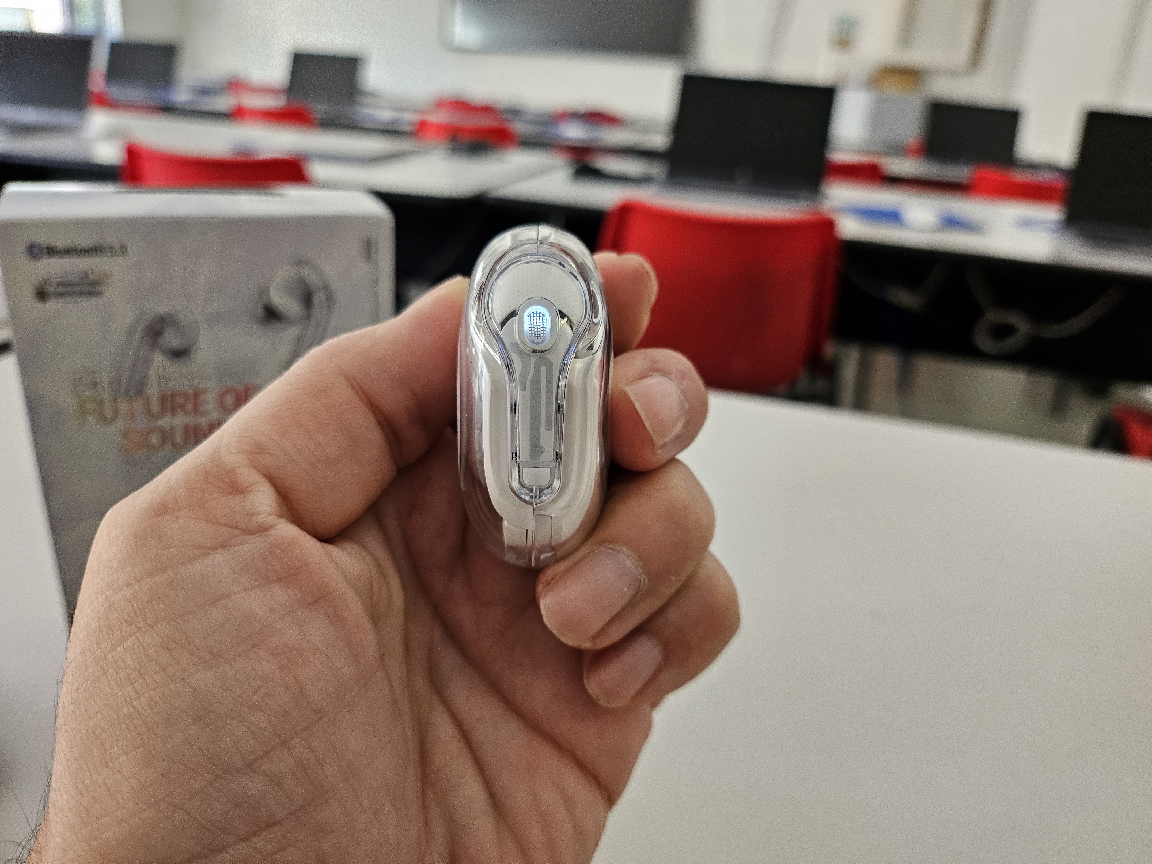Le cuffie sono trasparenti, permettendo di vedere i circuiti all’interno della custodia e delle cuffie stesse, un dettaglio che aggiunge un tocco di eleganza.