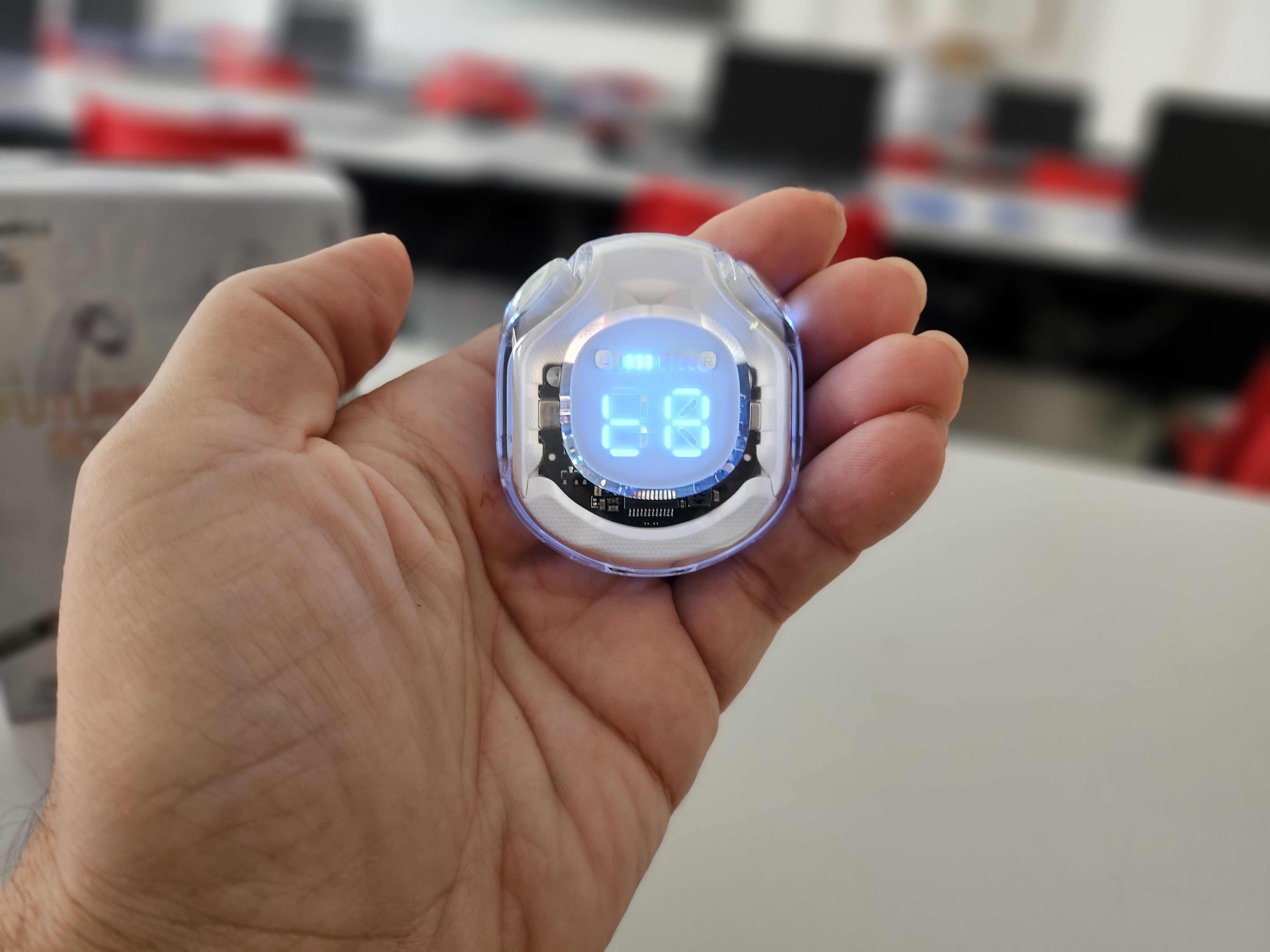 Acefast Crystal (2) T8 sono dotate di un indicatore digitale della batteria con una luce intermittente che mostra la percentuale di batteria rimasta nella custodia, mentre sopra di esso ci sono barre di stato separate per ciascuna cuffia.