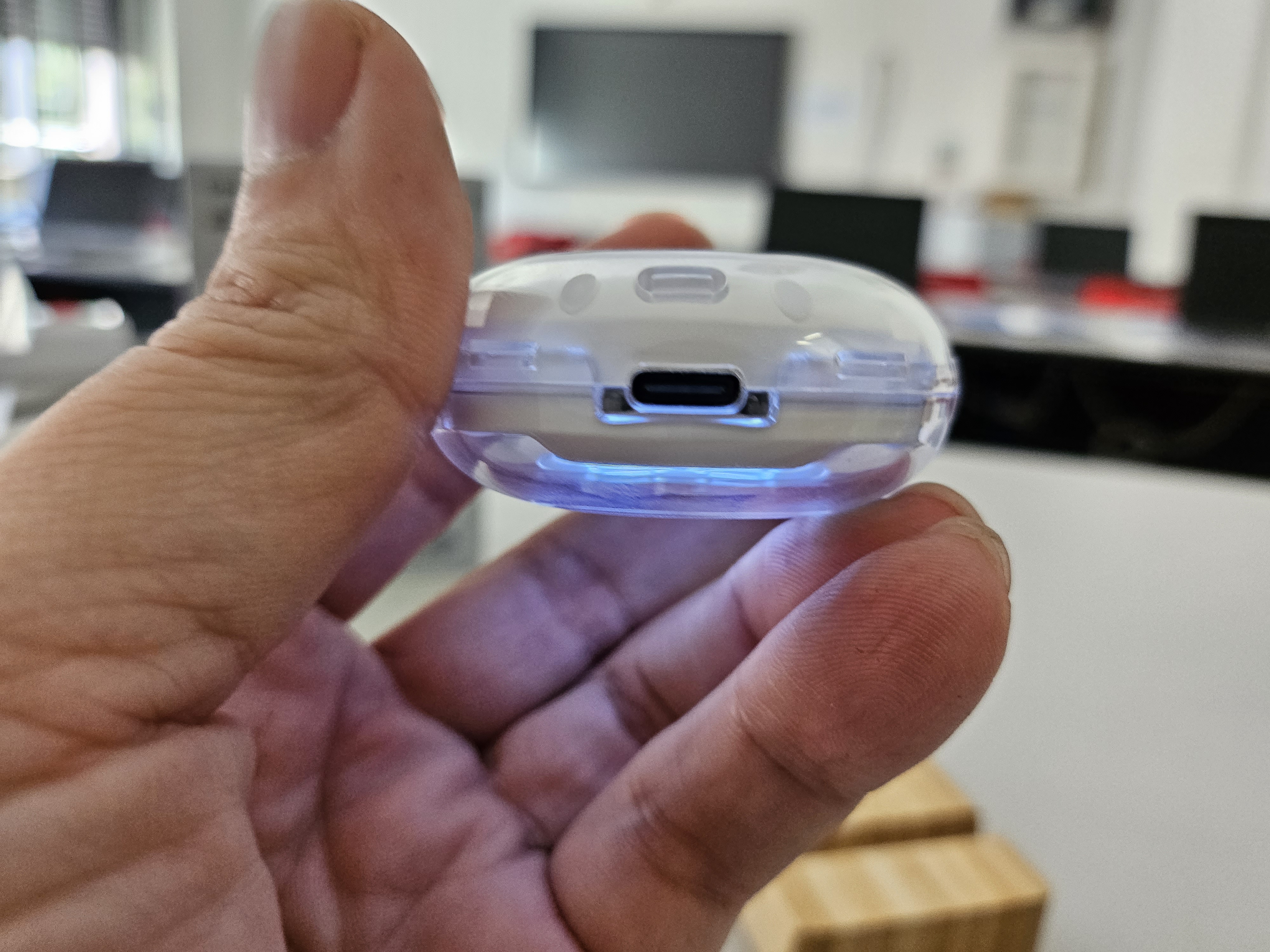 Non sono presenti pulsanti fisici sulla custodia, è possibile controllare le cuffie tramite comandi touch, ma solo la porta Usb C per la ricarica nella parte inferiore.