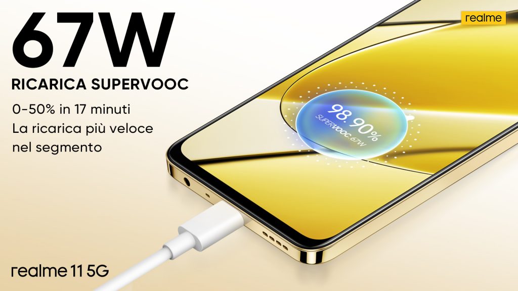 Un altro elemento rivoluzionario di Realme 11 5G è la sua straordinaria capacità di ricarica SUPERVOOC da 67W. Questa caratteristica rappresenta una vera rarità all’interno del segmento di mercato a cui questo smartphone si rivolge. Realme ha incrementato notevolmente la velocità di ricarica, passando da un tradizionale 33W a un incredibile 67W. Questo significa che Realme 11 5G è in grado di caricare la sua batteria generosa da 5000 mAh al 50% in soli 17 minuti.