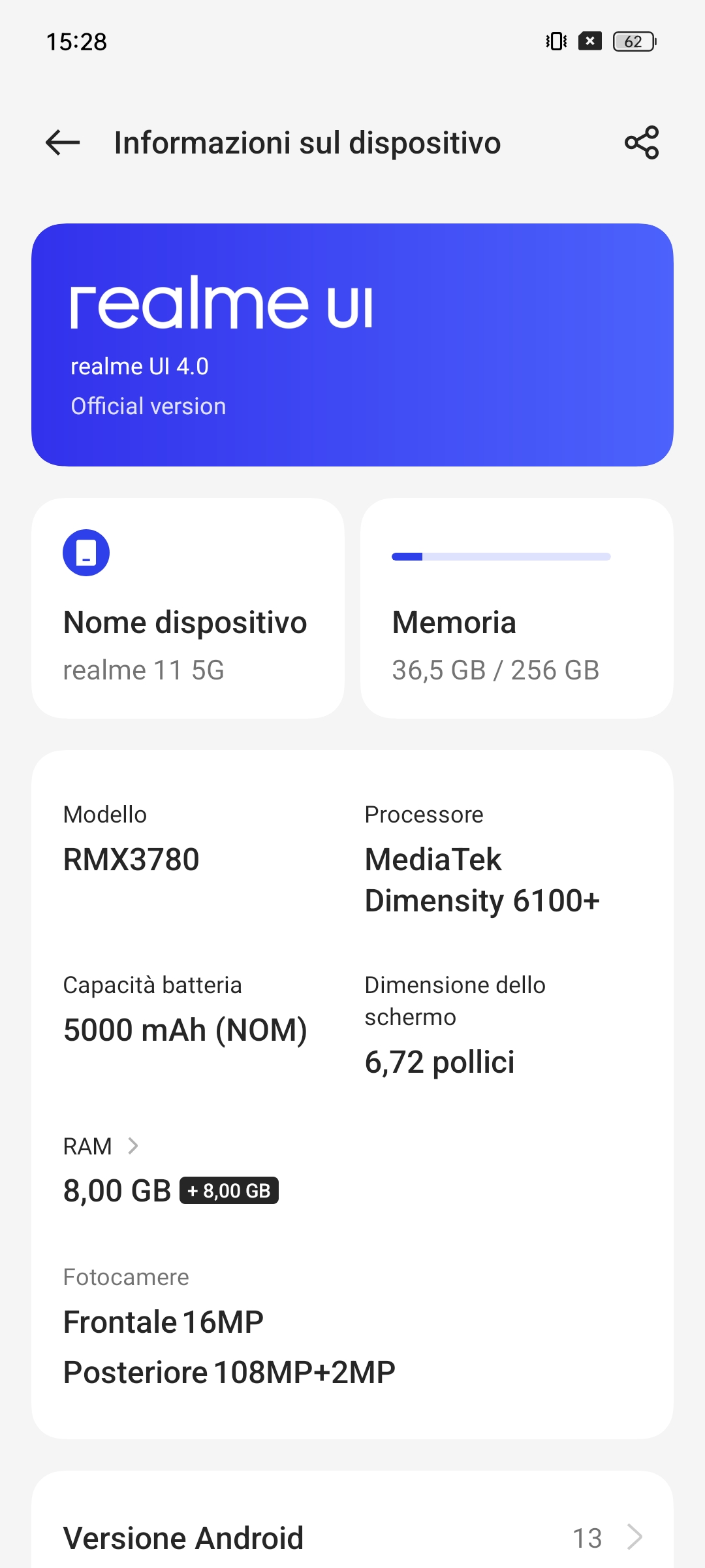 l cuore del Realme 11 5G è rappresentato dal chipset MediaTek Dimensity 6100+ 5G, costruito su un processo di produzione a 6 nanometri. Questo SoC offre una frequenza di clock massima di 2.2GHz, e viene supportato da 8GB di RAM, con un tocco di “Dynamic RAM” che permette un incremento aggiuntivo di 4GB e 256GB di spazio di archiviazione UFS 2.2, e offre anche uno slot per schede microSD per espandere ulteriormente la memoria.