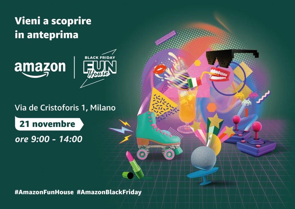 Dal 21 al 26 novembre, in concomitanza con la settimana del Black Friday, Amazon Italia inaugura il “Black Friday Fun House,” uno spazio esperienziale pubblico che offre un’immersione nell’atmosfera funky e retrò degli anni ’80 e ’90, dedicato allo shopping e al divertimento.