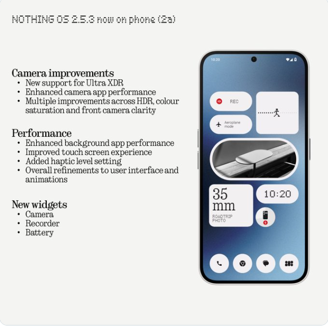 L’aggiornamento Nothing OS 2.5.3 per il Phone (2a) include il supporto per Ultra XDR sulla fotocamera. Inoltre, vengono apportate migliorie alle prestazioni dell’app della fotocamera, al processing HDR e alla saturazione del colore.