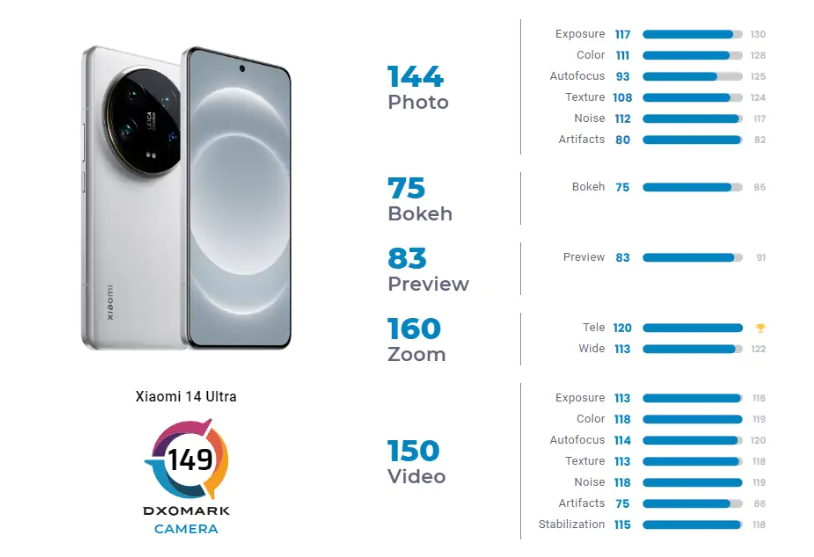 Nonostante le specifiche impressionanti, la fotocamera del Xiaomi 14 Ultra non è entrata nella top ten di DxOMark, classificandosi tredicesima nella categoria globale e tra i dispositivi ultra-premium.