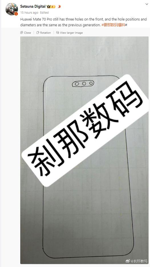 Secondo un disegno condiviso dal leaker Setsuna Digital, il Huawei Mate 70 Pro manterrà i tre fori frontali presenti nel Mate 60 Pro, con posizioni e diametri simili.