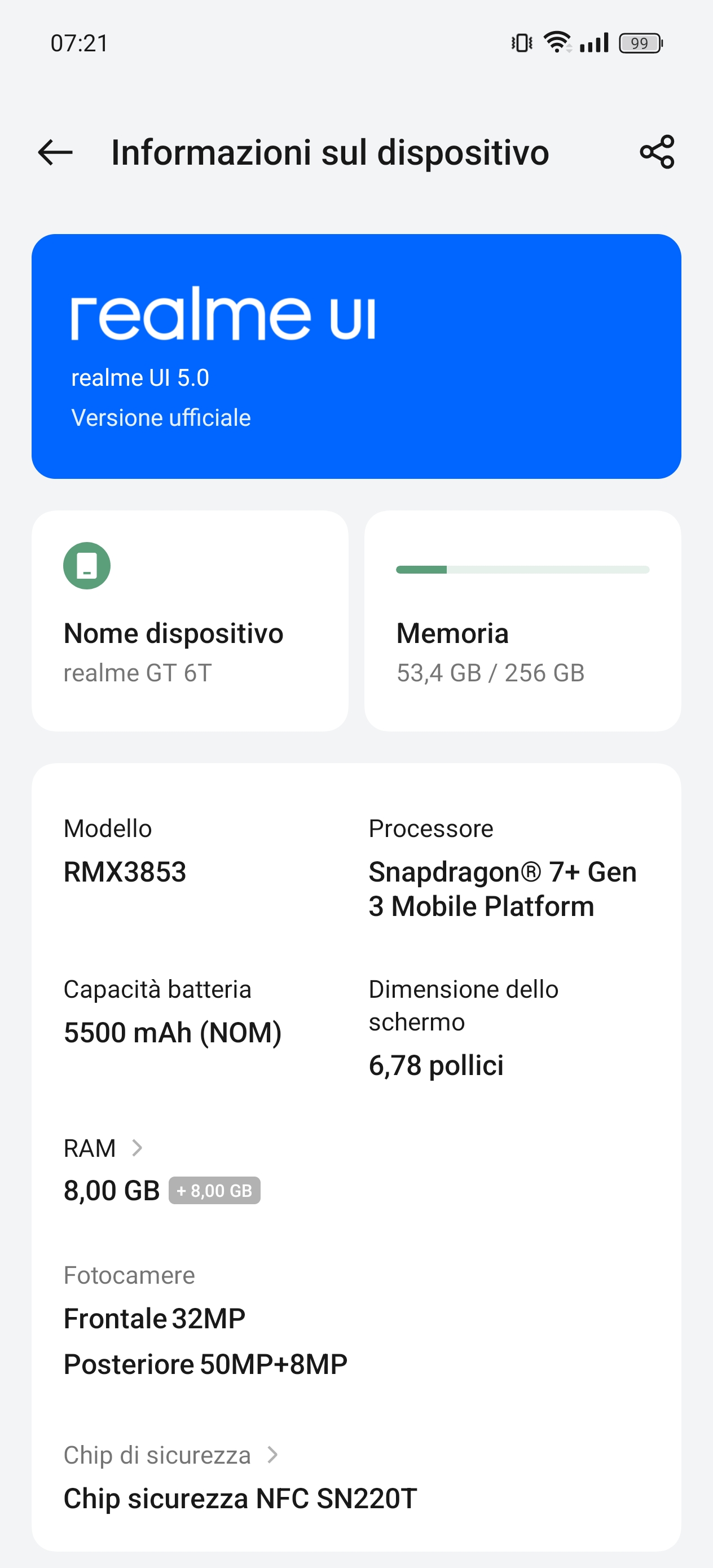 Al pari di GT6 anche la versione 6T è dotata di Android 14 con la personalizzazione RealmeUI 5.0.