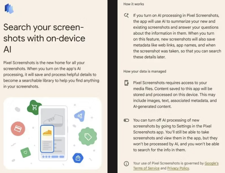 Un’immagine trapelata mostra il marchio Google AI con funzioni già viste, come Gemini che sostituisce Google Assistant e Circle to Search, ma introduce anche diverse nuove aggiunte. La descrizione della funzione più interessante, chiamata Pixel Screenshots, promette di sfruttare l’IA sul dispositivo per rendere gli screenshot ricercabili e consentire conversazioni tipo chatbot sui contenuti degli screenshot, utilizzando modelli di IA come Gemini Nano. Questa funzione ricorda molto la funzione Recall di Microsoft per Copilot AI, che ha ricevuto molte critiche per evidenti preoccupazioni sulla privacy.