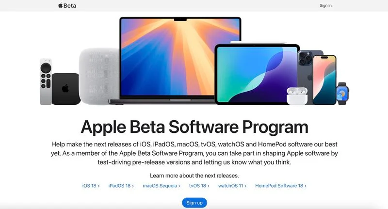 Iscriviti al programma beta: Tocca il pulsante “Sign up” e inserisci le credenziali del tuo ID Apple, oppure accedi con il tuo ID Apple se sei già iscritto per testare una precedente beta.