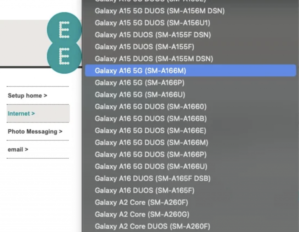 Conferma di Galaxy A16 sul sito EE nel Regno Unito