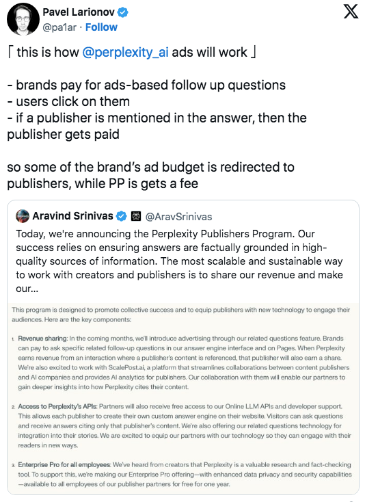 Non è chiaro se il modello di condivisione dei ricavi di Perplexity sarà sufficiente a coprire le perdite di ricavi dovute al calo del traffico. Inoltre, i ricavi dell’azienda dipenderanno in gran parte dagli annunci pubblicitari e da quanto bene riuscirà a monetizzare i contenuti sulla sua piattaforma.