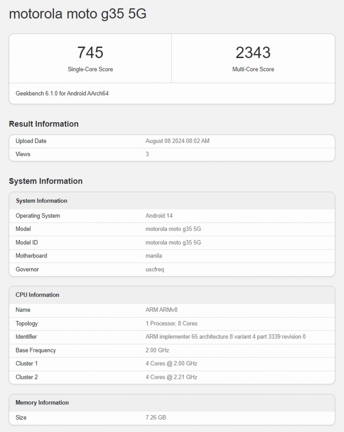 Il Moto G35, secondo quanto rivelato da Geekbench, sarà dotato di 8 GB di RAM, il che rappresenta un miglioramento significativo rispetto al Moto G34. Questa quantità di memoria consentirà un multitasking più fluido e una gestione più efficiente delle applicazioni, migliorando l’esperienza utente complessiva. Questo aumento della RAM potrebbe anche suggerire che il Moto G35 sarà in grado di supportare giochi e applicazioni più impegnative rispetto al suo predecessore.
