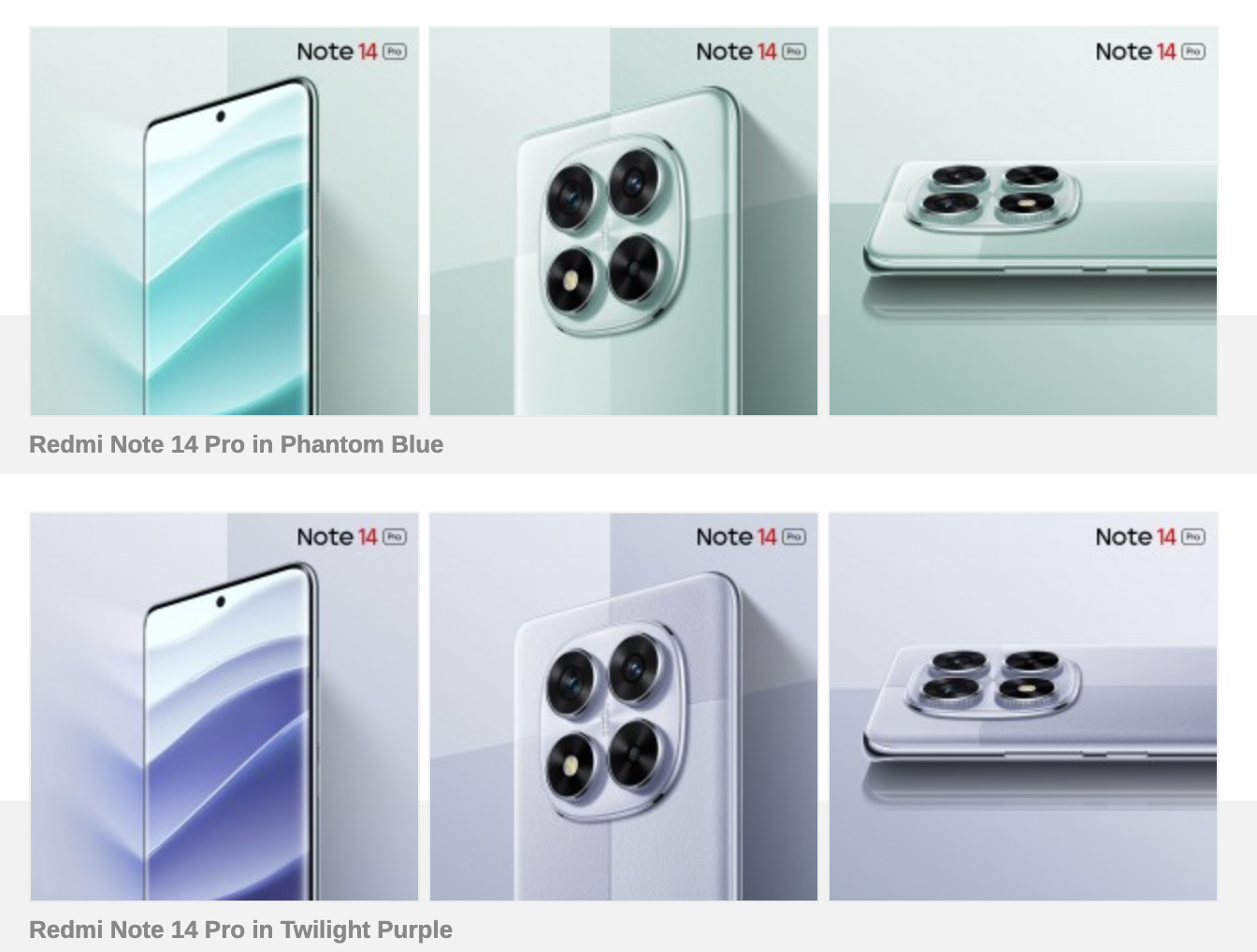 Accanto a Redmi Note 14 Pro+ in bianco, Xiaomi ha presentato anche Redmi Note 14 Pro nelle colorazioni Phantom Blue e Twilight Purple. Questi modelli mantengono lo schermo curvo e l’intaglio a foro, ma differiscono per l’assenza della cupola in vetro sopra le lenti, conferendo un aspetto più sobrio ma altrettanto elegante.
