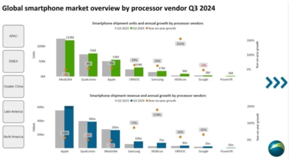Per quanto riguarda le spedizioni di smartphone, MediaTek ha mantenuto la prima posizione come principale designer di chip per il Q3 a livello mondiale, seguito da Qualcomm, Apple, UNISOC, Samsung, HiSilicon e Google.