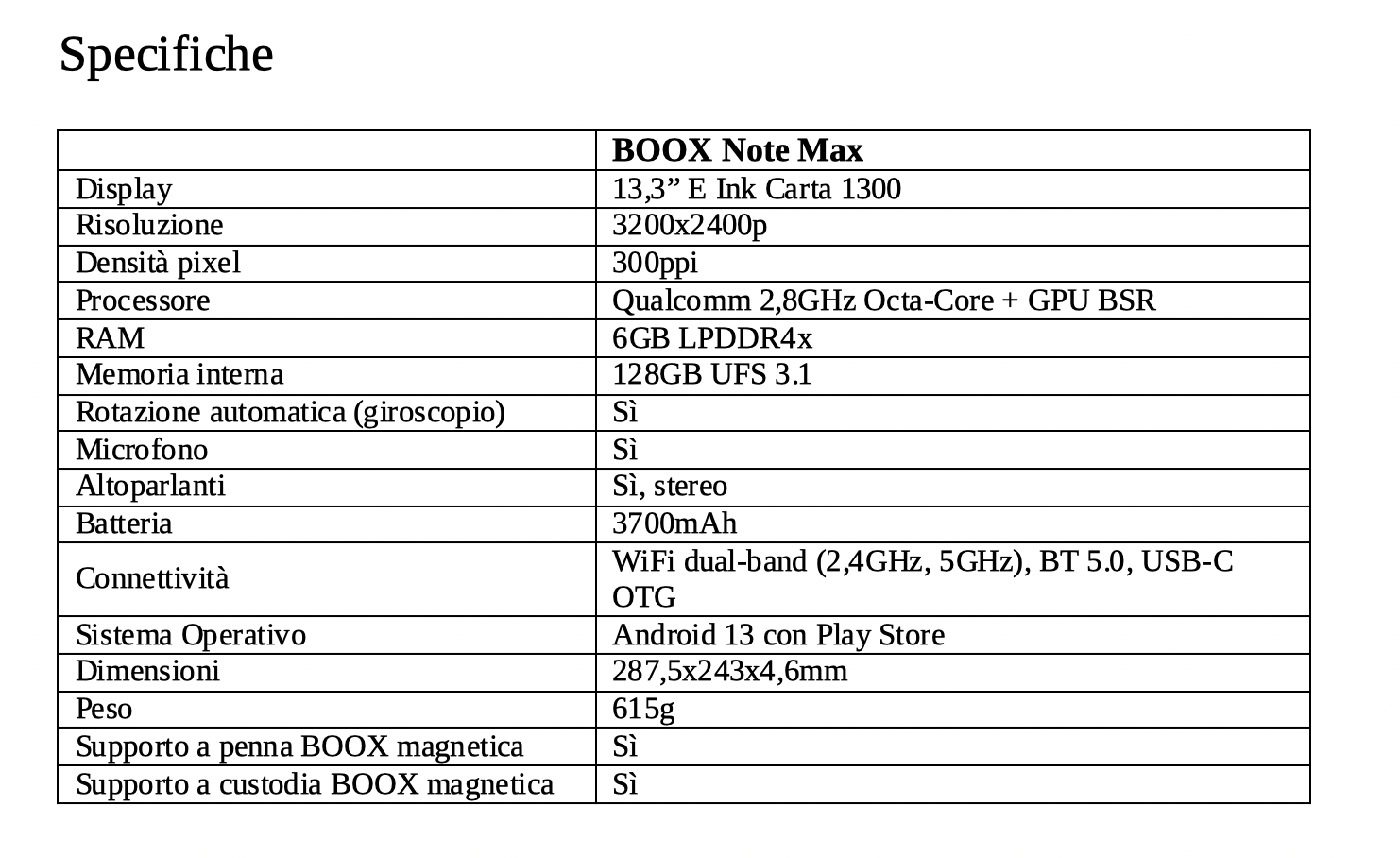 Dotato di un processore Octa-core da 2,8GHz, 6GB di RAM e la tecnologia BOOX Super Refresh (BSR), Note Max assicura un’esperienza fluida e senza interruzioni, consentendo agli utenti di passare agevolmente tra le applicazioni. Operando su Android 13, dispositivo offre accesso a un’ampia gamma di app attraverso Google Play Store.