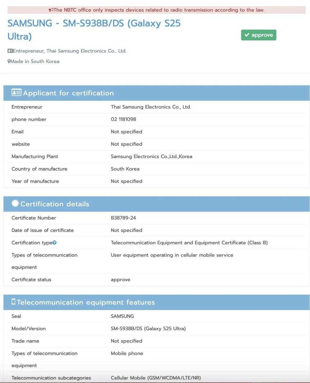 Tra le novità, il modello di punta Galaxy S25 Ultra è stato avvistato nel database NBTC della Thailandia, confermando alcune specifiche tecniche.