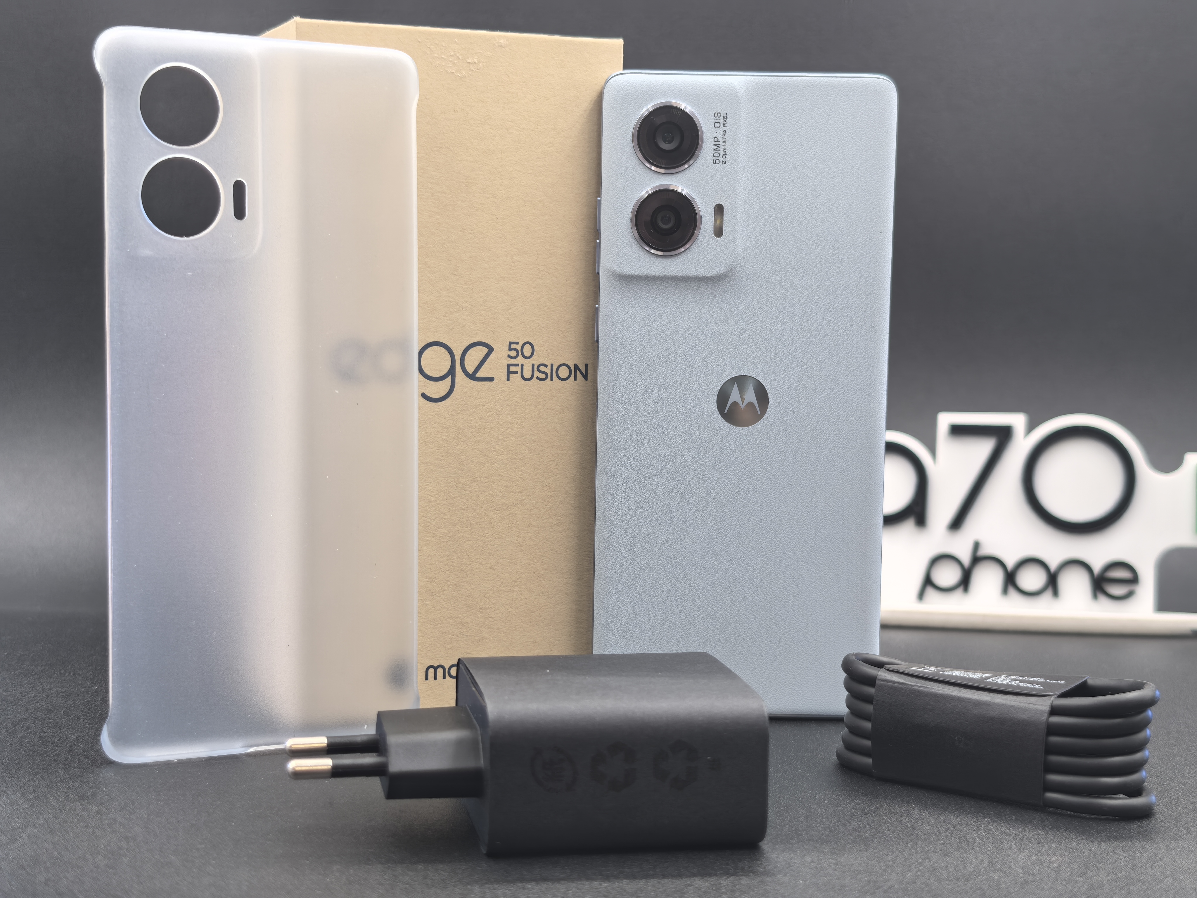 All’interno della confezione, il Motorola Edge 50 Fusion è accompagnato dal caricatore rapido da 68W, un cavo USB-C, la custodia in plastica rigida semitrasparente e opaca, la guida rapida e lo strumento per estrazione carrello nano sim.