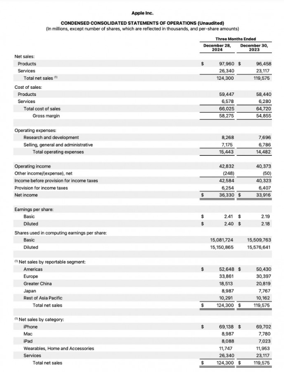 Nel trimestre conclusosi il 28 dicembre 2024, Apple ha segnato un record storico nei suoi guadagni, consolidando la sua posizione di leader nel settore tecnologico. Con ricavi che hanno raggiunto i 124,3 miliardi di dollari, la crescita annuale del 4% dimostra la continua capacità dell’azienda di innovare e espandersi in mercati globali.