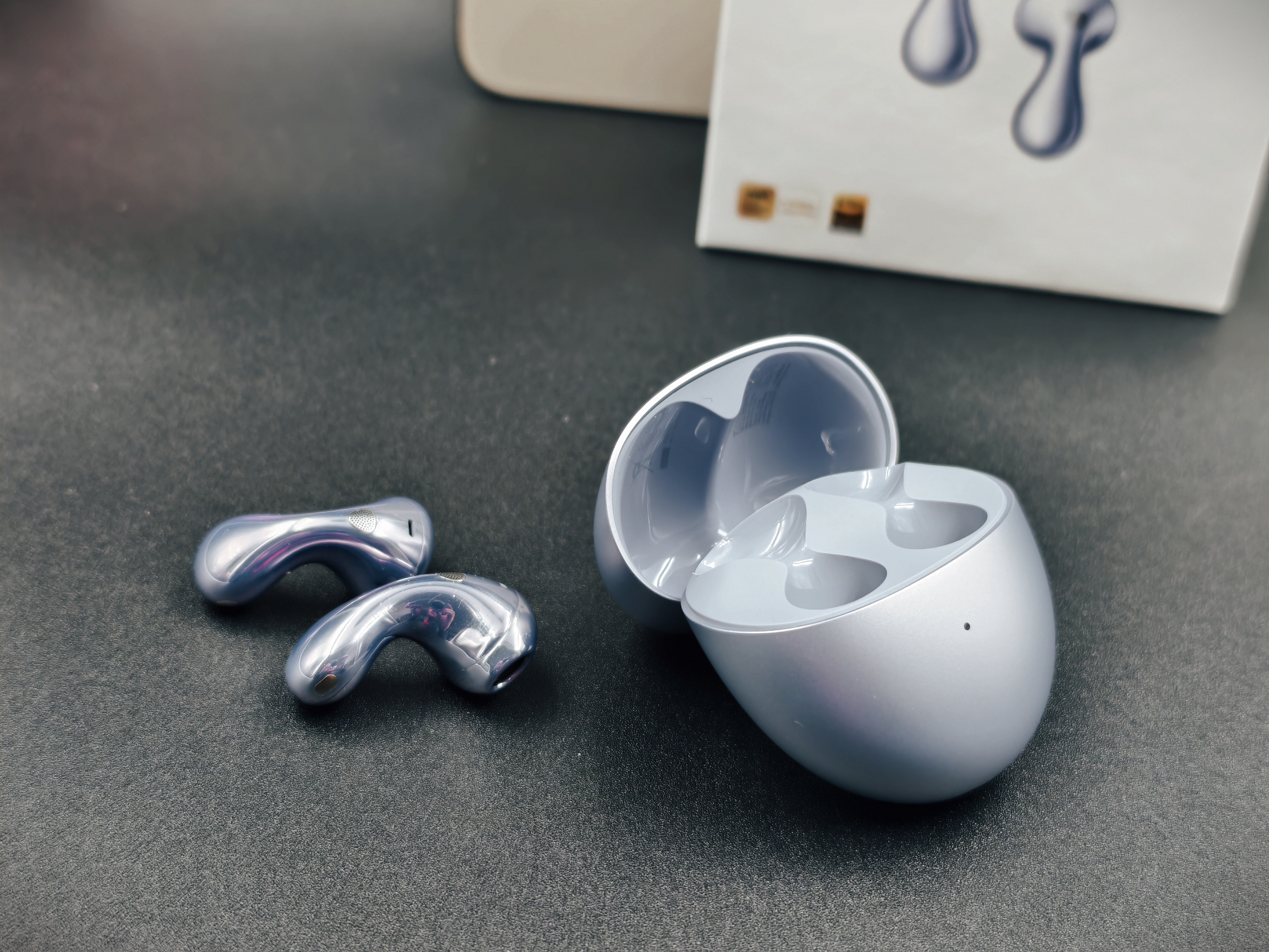 Il case di ricarica riprende una forma arrotondata a “sassolino” ed è altrettanto leggero (appena 40,3 grammi). La finitura lucida e i colori disponibili (bianco latte, nero e un originale viola aurora) gli conferiscono un look elegante e moderno.