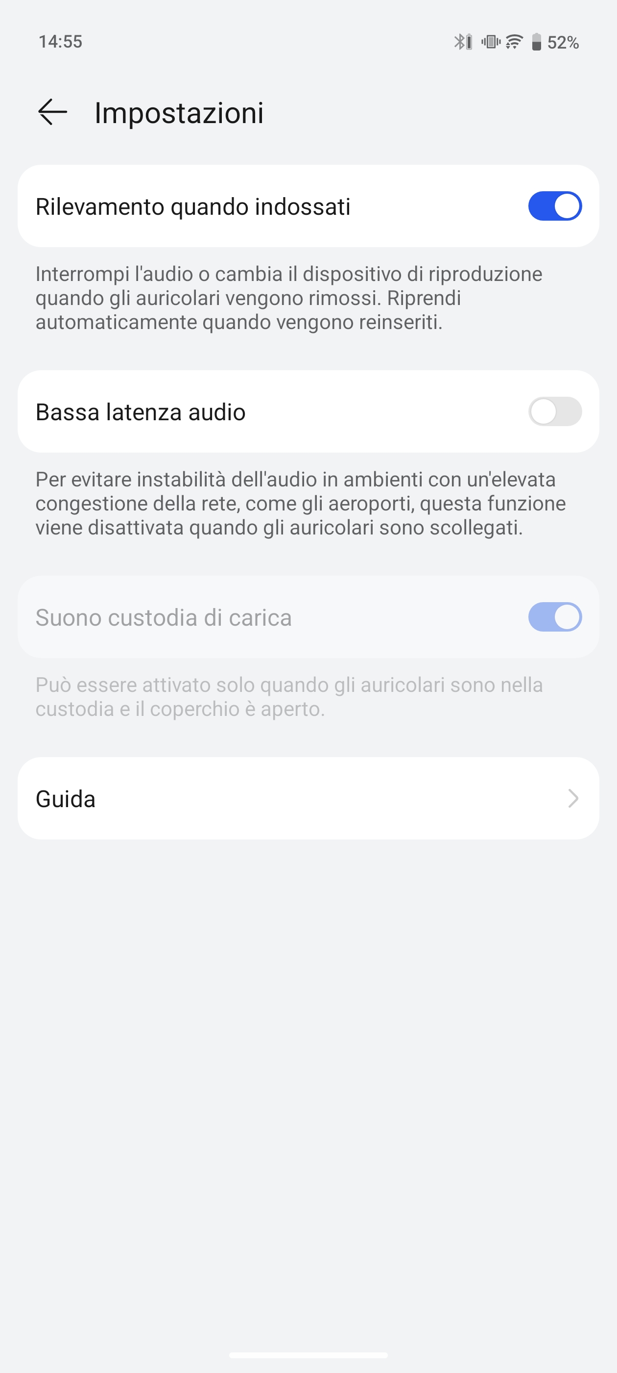 L’app offre una vera marea di opzioni: dal controllo dell’ANC alla personalizzazione dei comandi touch, passando per l’equalizzatore e gli aggiornamenti firmware. Inoltre, mostra in tempo reale lo stato della batteria di ciascun auricolare e della custodia.