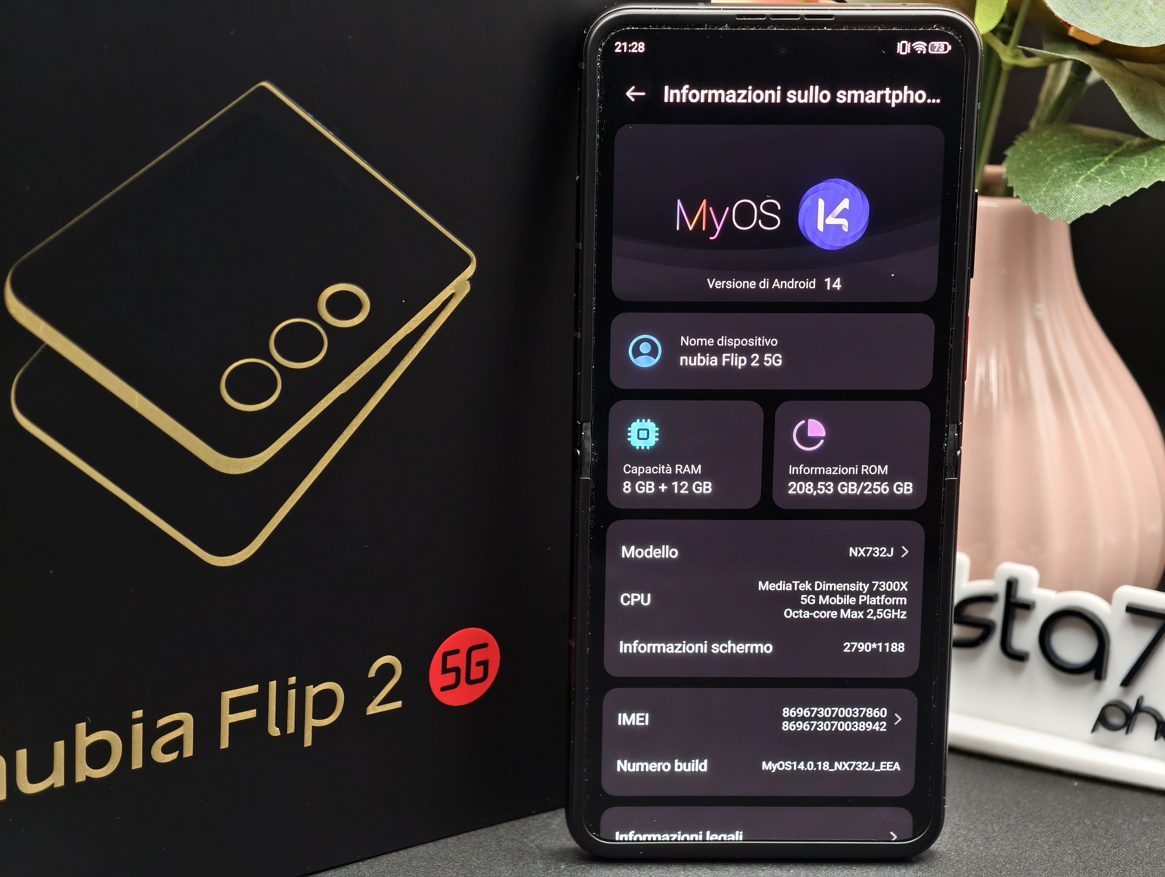 Per quanto riguarda RAM e memoria interna, nubia Flip 2 5G è disponibile nella versione con 8 GB di memoria Ram espandibile di altri 12 GB virtualmente e 256 GB di memoria Rom, in questo caso fissa. La RAM è di tipo LPDDR4X mentre la memoria interna UFS 2.2, significativamente meno performante in termini di velocità di lettura e scrittura rispetto alla UFS 3.1 o alla più recente UFS 4.0.