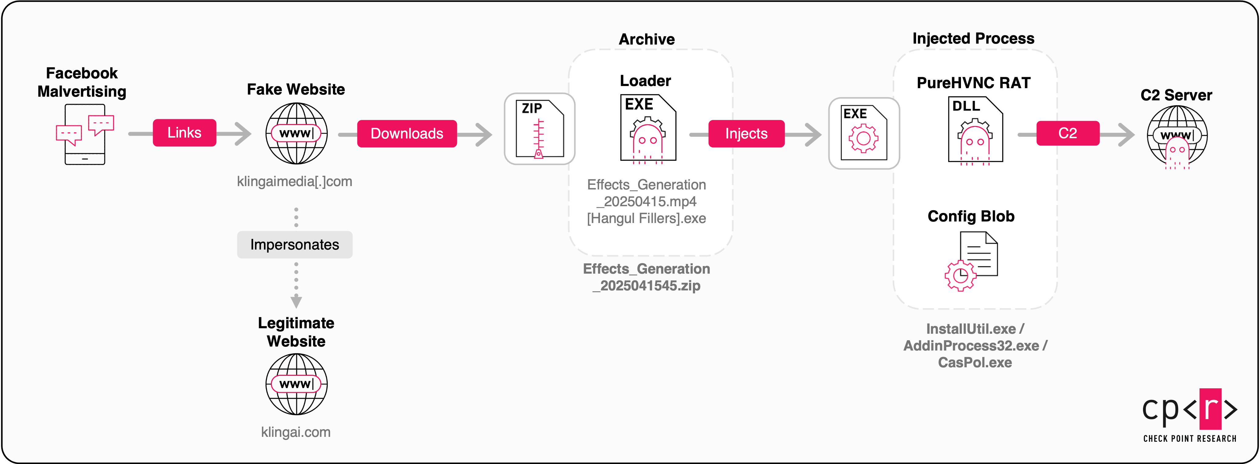 L’attacco inizia con falsi annunci sui social media. Dall’inizio del 2025, il team di Check Point Research ha identificato circa 70 post sponsorizzati, che promuovono in maniera non autentica il popolare strumento di intelligenza artificiale Kling AI. Questi annunci provengono da pagine Facebook convincenti ma fraudolente, progettate per assomigliare alla vera azienda.