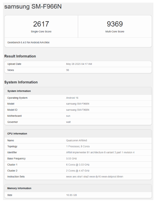 Le informazioni provengono da Geekbench, dove il modello SM-F966N, probabilmente una versione sudcoreana del dispositivo, ha mostrato prestazioni promettenti. I core principali del chip toccano i 4,47 GHz, indicando una personalizzazione mirata. Si tratta di una configurazione molto simile a quella attesa sulla gamma Galaxy S25.
